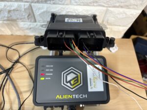 ▲ ALIENTECH専用機材を使用してECUにアクセス。精密かつ安全に書換えを行います。